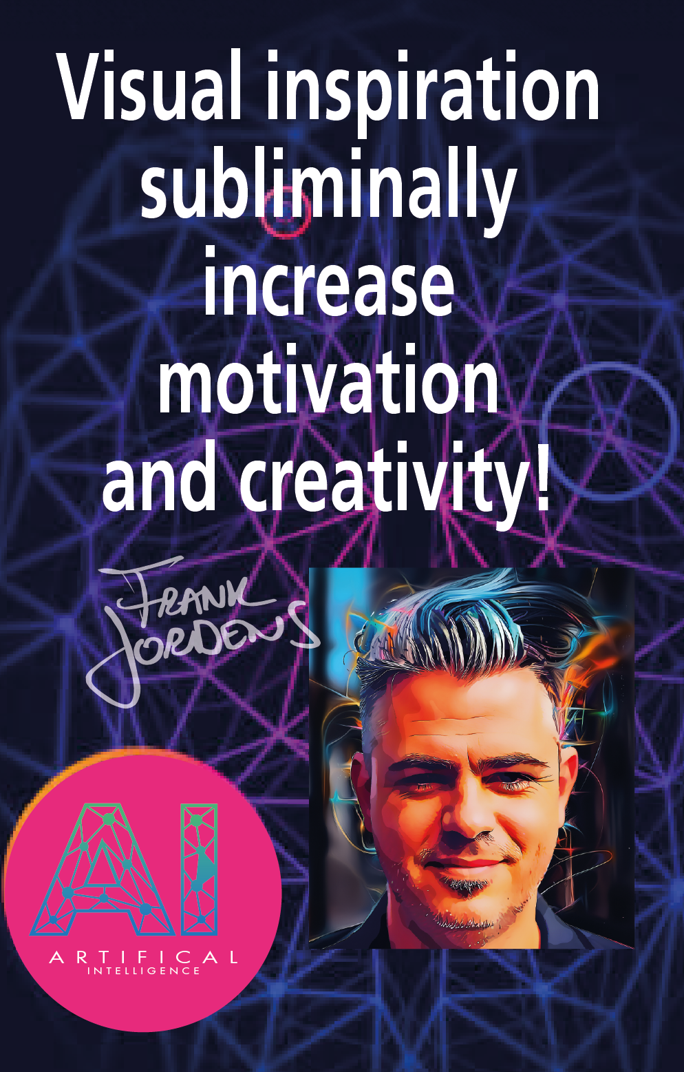 Deze Art-eyedeas komen uit het creatieve brein van creativity-coach Frank Jordens. Met zijn expertise in AI-technieken, gecombineerd met zijn grafische opleiding, ontstond tijdens de pandemie een reeks van kleurrijke schilderijen. Subliminale werken, die je motiveren, inspireren en je ruimtes kleur geven.